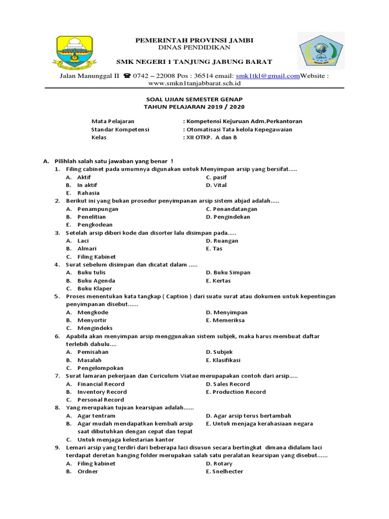 Latihan Soal Usp Unbk Bahasa Indonesia Sma Smk 2021 Sainsologi from www.sainsologi.com Soal jawab otk perkantoran kls 10,11,12. Demikian tentang soal penjas kelas 12 yang bisa dijadikan referensi contoh soal uts semester genap atau ganjil dan mencari kunci. Setelah adanya revisi kurikulum 2013 (k13) untuk sekolah menengah kejuruan (smk), mata pelajaran prakarya dan kewirausahaan (pkwu) berubah nama menjadi produk kreatif dan kewirausahaan (pkk). Pilihlah salah satu jawaban yang benar dengan memberi tanda silang (x) pada huruf a, b, c, d dan e! Pemain yang mengatur serangan dalam pertandingan sepak bola, adalah. Contoh soal essay penjas kelas 12. Soal jawab smk kls 12 otk pekantoran. Rpp administrasi perkantoran kelas xi.
